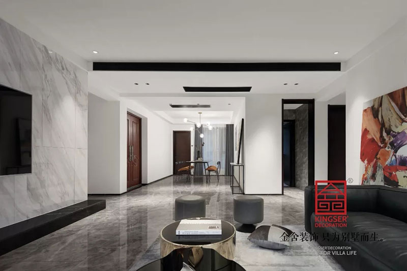 石家莊金舍裝飾-天山九峯175平米極簡風格裝修實景圖。極簡風格的美麗不光是一種快節(jié)奏生活中的剪影,也是一種特立獨行的生活方式,對于極簡人來說優(yōu)雅也是一種生活態(tài)度。同樣對于推崇極簡風,推崇工業(yè)風的人來說,極簡風格就是一個極致的風向標。