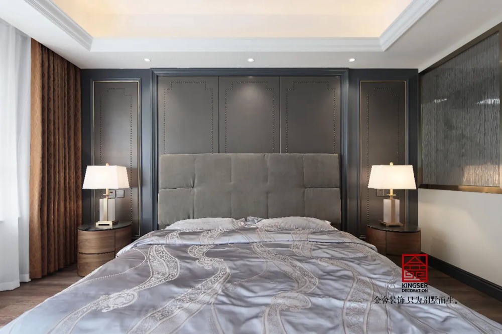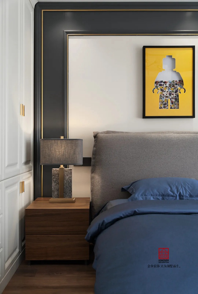 臥室都以溫潤的木頭地板舖陳,為空間增添柔軟的生活感,金屬床頭吊燈點(diǎn)綴素雅空間,帶來輕奢舒眠感?;疑妓嚨能洶差^是本案的設(shè)計(jì)亮點(diǎn),搭配精品家私展現(xiàn)空間獨(dú)特質(zhì)感。