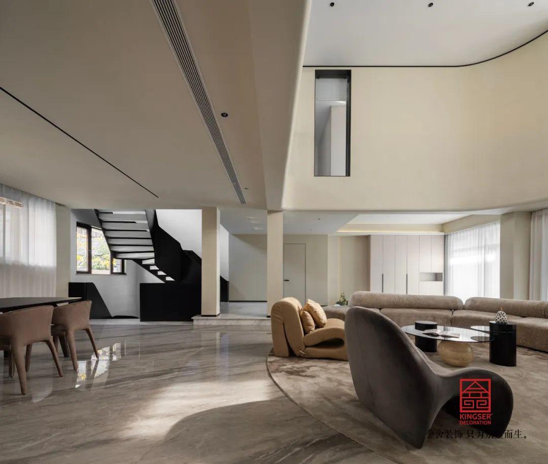 巨大的挑空空間之下,是設計師對于設計的把控,首層6米挑空客廳以鋼化玻璃幕墻打造通透感,雙層中空玻璃引入充沛自然光,半開放的廚房、島臺吧臺與落地窗景融為一體。全屋采用暖白、卡其、米咖等低飽和色調(diào),墻面啞光質(zhì)感涂料與淺咖沙發(fā)碰撞,塑造出極具質(zhì)感的空間。