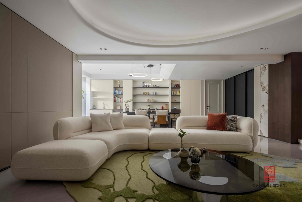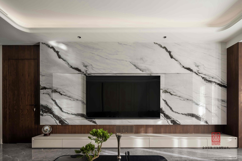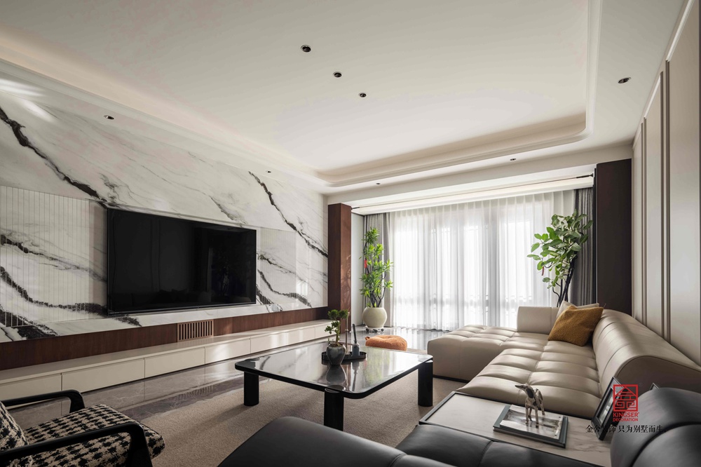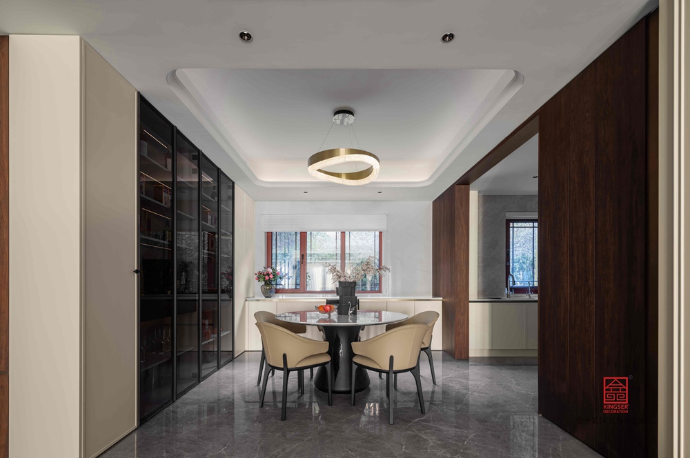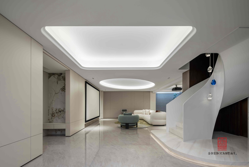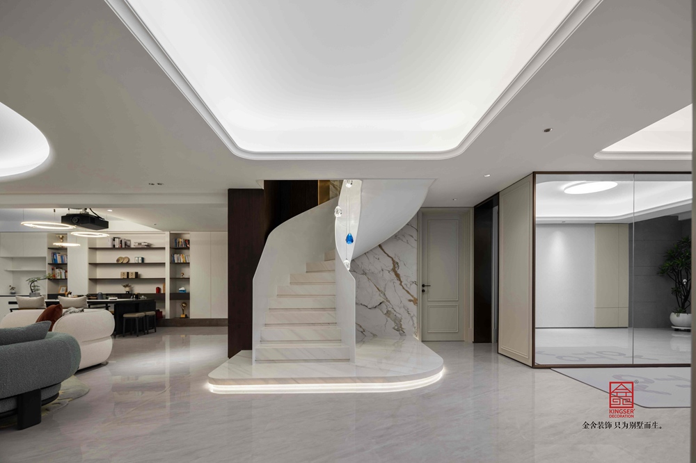 褪去城市繁冗華麗的外殼,回歸至與人的內(nèi)在共鳴,斑駁的光影在客廳空間徜徉,大理石與墻板的搭配,釋放出一種優(yōu)雅、沉靜及治愈的氛圍感,貫穿于整個(gè)別墅裝修空間的動(dòng)線。