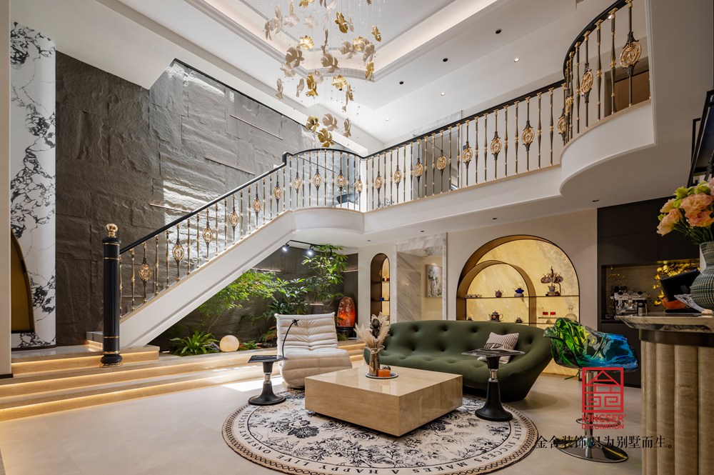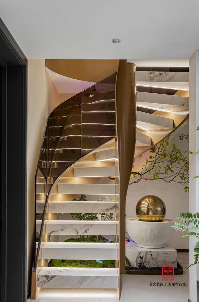 螺旋線條復(fù)刻鸚鵡螺自然韻律,金屬扶手勾勒利落光影,石材踏板沉淀溫潤(rùn)質(zhì)感。剛?cè)崤鲎查g,讓樓梯不止是通行空間,更成為家居里自帶焦點(diǎn)的藝術(shù)裝置。