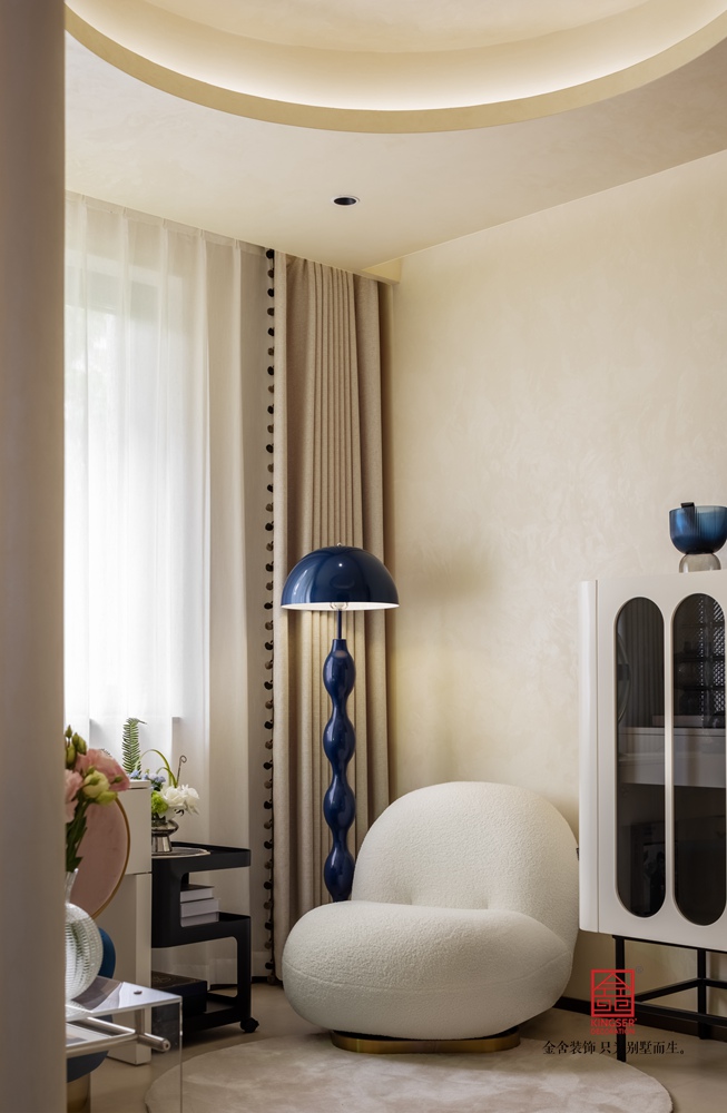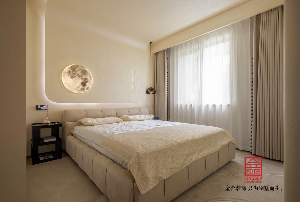 負(fù)二樓的臥室是客房,淺木家具配米白加金色床品,透著溫潤(rùn)感。飄窗邊設(shè)陽光區(qū),擺著幾個(gè)抱枕,夜晚枕著柔和燈光,能給來客一份歸家般的安穩(wěn)。