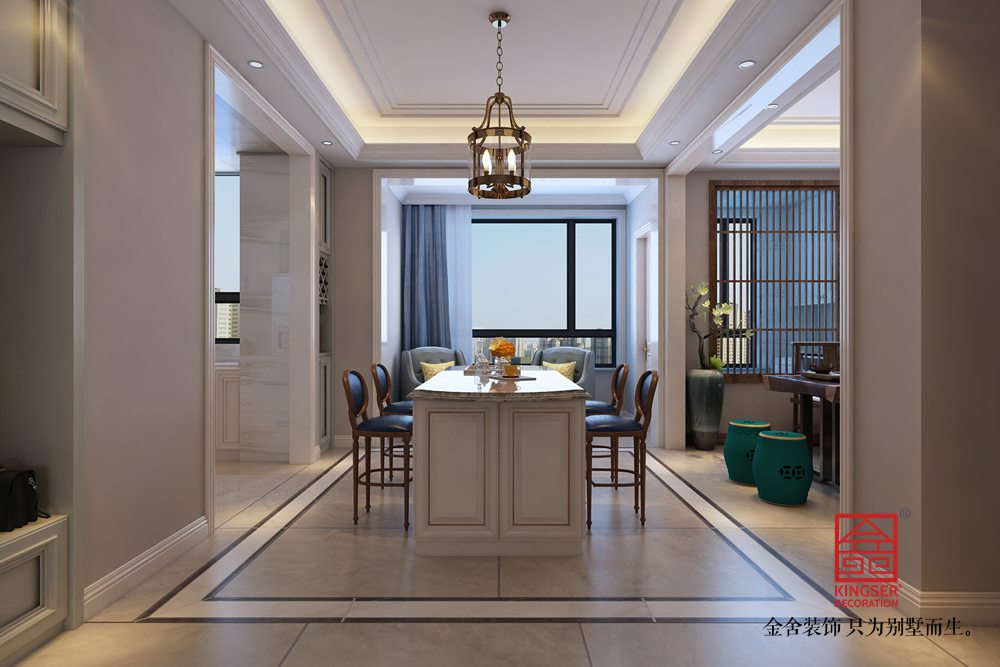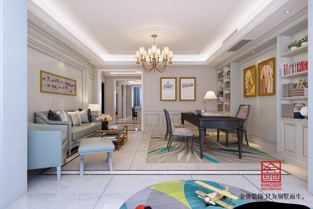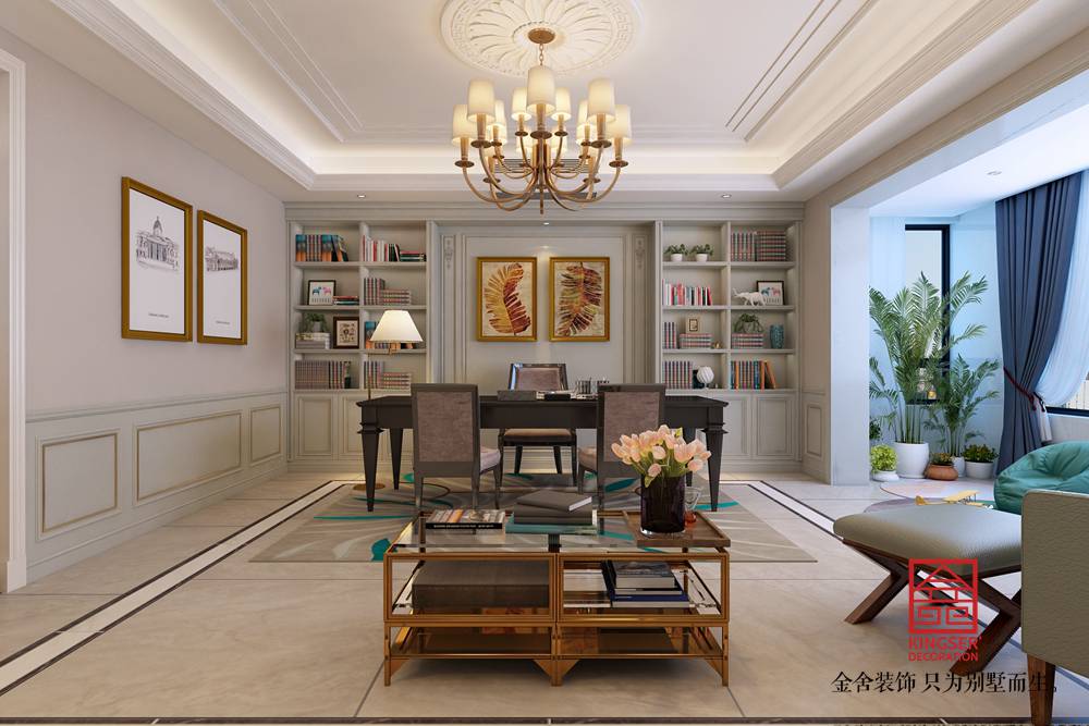 設(shè)計(jì)說明:此案例為石家莊金舍裝飾-榮盛華府200平米混搭風(fēng)格裝修效果圖。傳統(tǒng)的客廳以電視墻為主導(dǎo),沙發(fā)和茶幾的高度往往相差不大,這樣的高度差對(duì)于孩子寫作業(yè)或是成年人看書寫字和使用電腦是沒有舒適度可言的,因此一些有工作和學(xué)習(xí)需求的家庭可以考慮把家庭工作室融入客廳,利用靠墻的大操作臺(tái)和各種墻面擱板架,滿足多人工作的需求