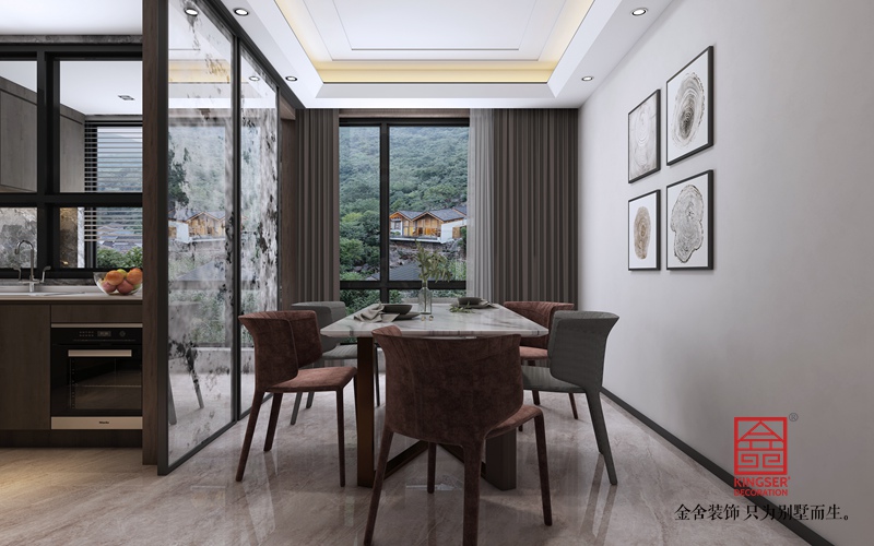 客餐廳南北通透、陽光穿堂而過。進(jìn)門玄關(guān)處石膏板凹凸造型搭配上藝術(shù)漆以金屬邊線做分界線裝飾分割更顯靈動。右邊緊接餐廳廚房,以玻璃門分割廚房和餐廳拉開門及是半開放式廚房。使餐廚空間更加靈動通透。