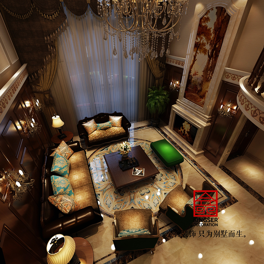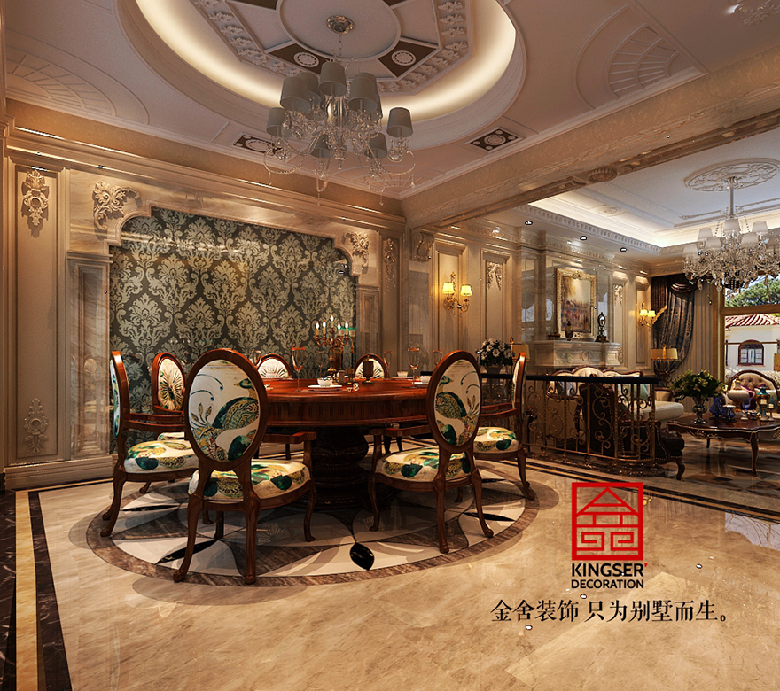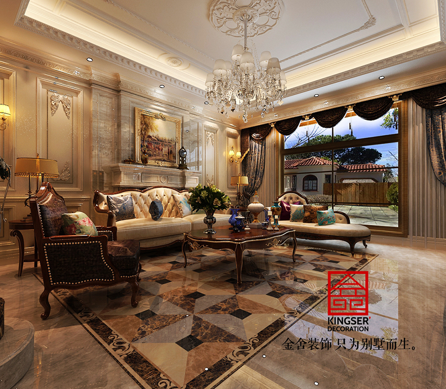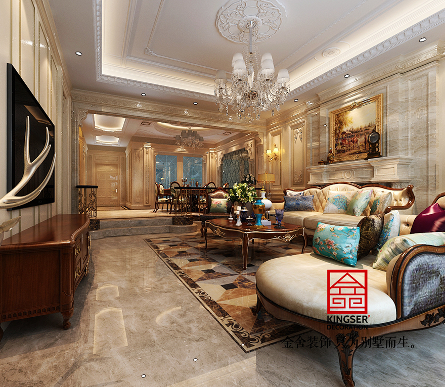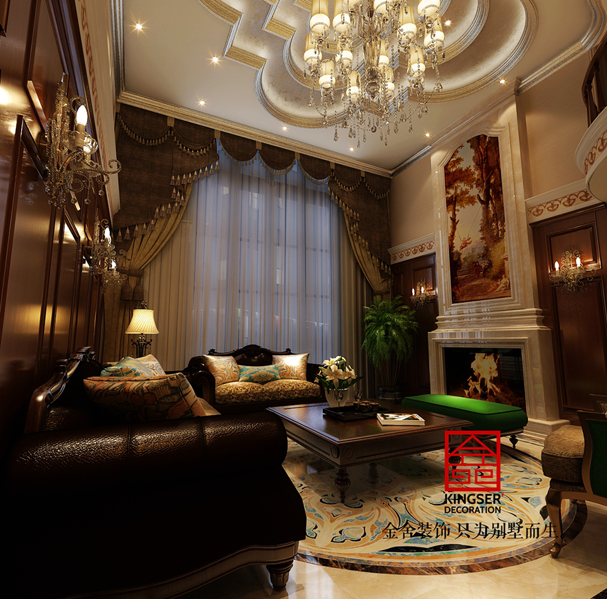 設(shè)計(jì)說(shuō)明:此案例為石家莊金舍裝飾-原河名墅380平美式風(fēng)格裝修效果圖。美式風(fēng)格強(qiáng)調(diào)以華麗的裝飾、濃烈的色彩、精美的造型達(dá)到華貴的裝飾效果。美式客廳頂部用大型燈池,并用華麗的 枝形吊燈營(yíng)造氣氛。門窗上半部做成弧形,并用帶有花紋的石膏線勾邊,室內(nèi)則有壁燈造型。墻面用優(yōu)質(zhì)乳膠漆,以襯托 豪華效果。地面材料以石材和地板為主。美式客廳用家具和軟裝飾來(lái)營(yíng)造整體效果,深色的像木和楓木家具,色彩鮮艷的 布藝沙發(fā),都是本案美式客廳里的主角。還有浪漫的羅馬簾,精美的油畫,制作精良的雕塑工藝品,都是點(diǎn)染美式風(fēng)格不 可缺少的元素。在美式家居空間里,在墻上掛金屬框抽象畫和攝影作品,選擇一些西方藝術(shù)名家的贗品,如人體畫,直接把西方藝術(shù)帶到家里,以營(yíng)造濃郁的藝術(shù)氛圍,表現(xiàn)主人的文化素養(yǎng)。