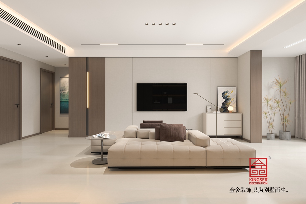 燈光設(shè)計(jì)上,結(jié)合了線性燈帶與點(diǎn)式射燈,既滿足了基礎(chǔ)照明需求,又通過光影變化增添了空間的層次感與藝術(shù)感。角落的綠植與裝飾畫,為空間注入自然生機(jī)與藝術(shù)氣息,整體布局開闊通透,每一處細(xì)節(jié)都彰顯出對品質(zhì)生活與美學(xué)體驗(yàn)的追求,打造出一個(gè)兼具實(shí)用性與美觀性的現(xiàn)代家居客廳。