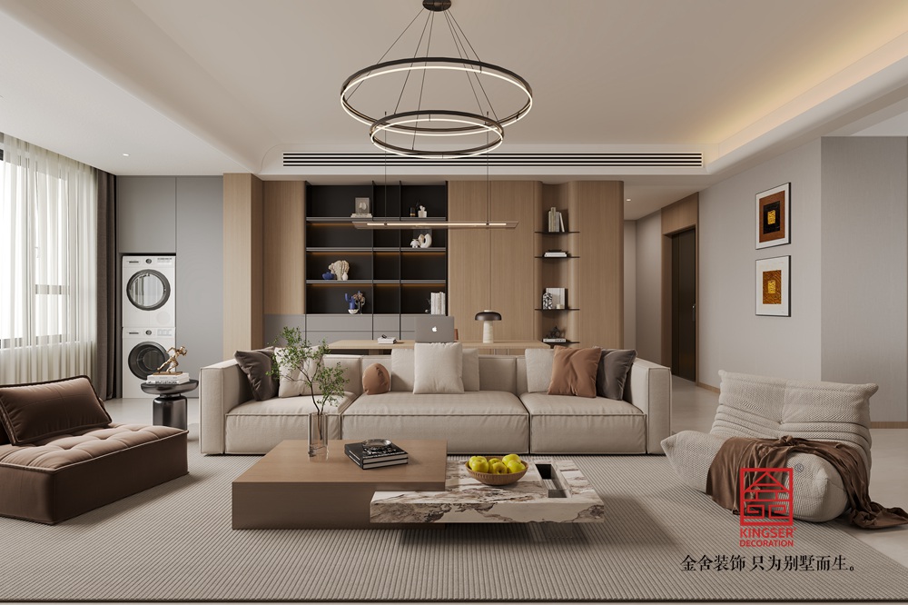 本客廳設(shè)計(jì)以現(xiàn)代簡(jiǎn)約風(fēng)格為核心,主打溫暖柔和的大地色系。空間布局上,將休閑與功能區(qū)巧妙融合,背景墻處的柜體設(shè)計(jì),兼具收納與展示功能,燈光點(diǎn)綴更顯精致。家具選擇注重舒適與質(zhì)感,淺米色大沙發(fā)搭配棕色系單品,營(yíng)造出溫馨和諧的氛圍。雙層環(huán)形吊燈造型別致,為空間增添時(shí)尚感。整體通過(guò)材質(zhì)、色彩與燈光的搭配,打造出一個(gè)舒適、雅致且充滿生活氣息的別墅起居空間。